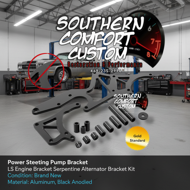 Power Steering Pump Bracket, LS Engine Bracket Serpentine Alternator Bracket Kit --Condition: Brand New --Color: Black --Material: Aluminum --Surface Finish: Anodized --Placement on Vehicle: Driver Side (US)